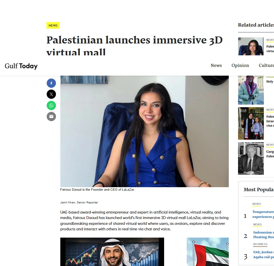 UAE-based award-winning entrepreneur and expert in artificial intelligence, virtual reality, and media, Fairouz Daoud has launched world’s first immersive 3D virtual mall LaLaZar, aiming to bring groundbreaking experience of shared virtual world where users, as avatars, explore and discover products and interact with others in real time via chat and voice.